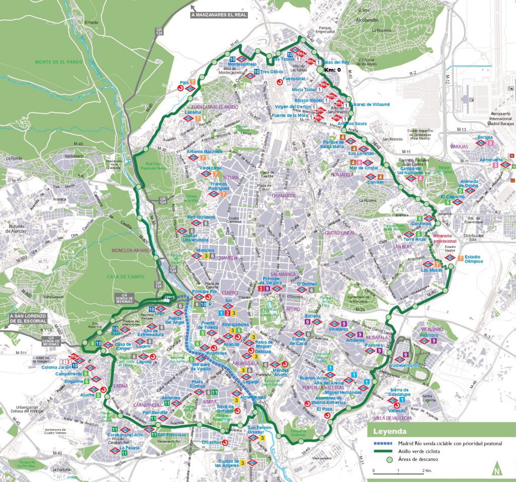 You can begin anywhere on the loop and do it either clockwise or counter-clockwise, but common starting points are along the Madrid Río around Casa de Campo.