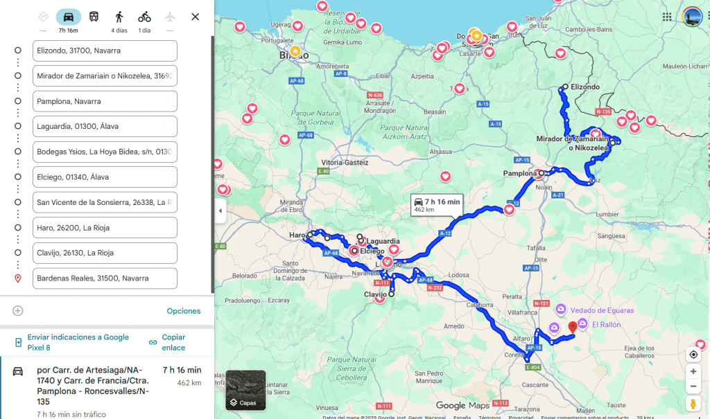 This seven-hour road trip begins (or ends if you want to do it in reverse) in Navarra, in the green valleys of Elizondo and the viewpoint of Zamarain, before heading to the region’s capital, Pamplona.