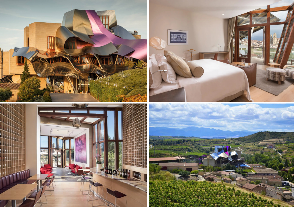 First up is one of Spain’s most iconic luxury hotels, the Hotel Marqués de Riscal, designed by Frank Gehry. This iconic hotel is found in La Rioja’s medieval town of Elciego.